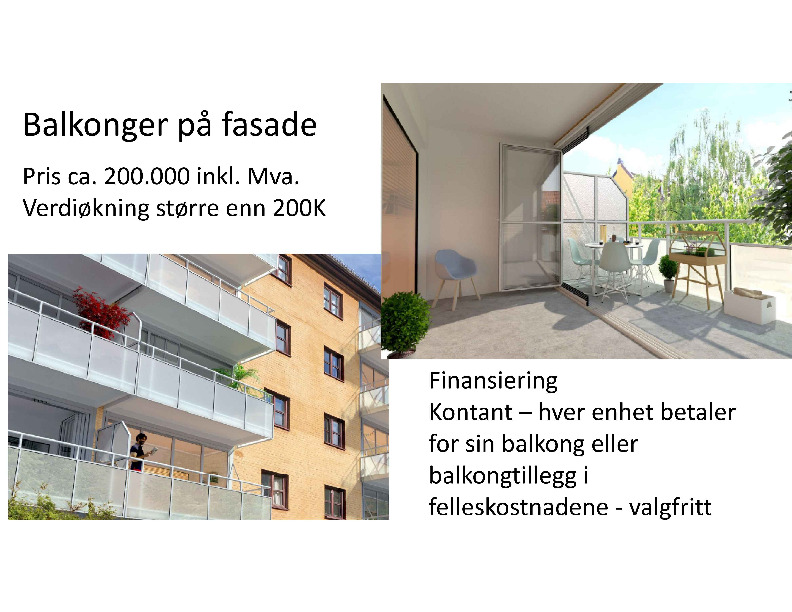 Nye balkonger – nye forslag som vil generere vesentlig høyere fellesomkostninger. Fachenberg opplyser i et styremøte at han har «undersøkt litt rundt» om nye balkonger. Det er kommet tilbud fra Balko AS.